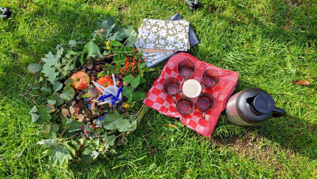 De natuur heeft op dit moment veel te bieden. Fruit, noten, zaden en bessen, een mooie najaarszon. In stilte wandelend keken de deelnemers rond naar de bladeren die prachtig verkleuren, de paddenstoelen en elfenbankjes, naar de bessen in de struiken, de uitgebloeide schermbloemen, kastanjes en hazelnoten en nog veel meer. Kortom, naar de schatten van de herfst.