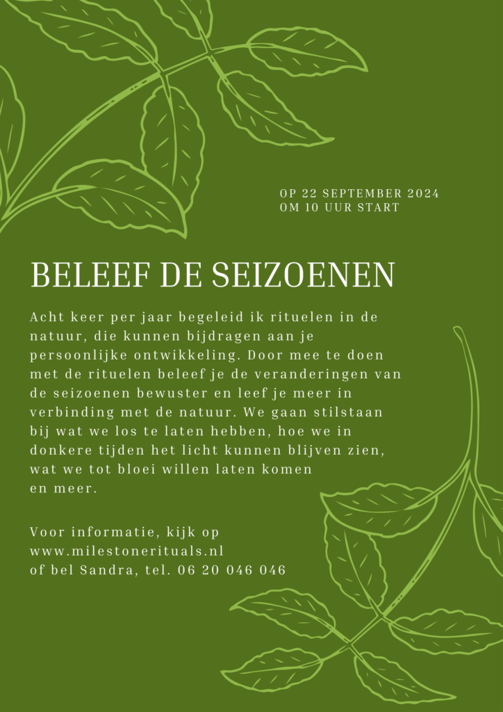 Onder het kopje ‘Agenda’ kun je iets meer lezen over Beleven van de seizoenen. Er is nog maar voor twee deelnemers een plekje, dus als het je leuk lijkt om mee te doen, meld je dan snel aan!